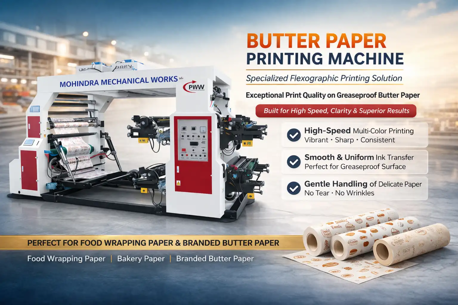 The Butter Paper Printing Machine is a specialized product under the Flexographic Printing Machine, designed for high-quality printing on butter paper (greaseproof paper). The machine ensures clear print visibility, smooth ink transfer, and excellent print quality without affecting the non-stick and grease-resistant properties of the paper.