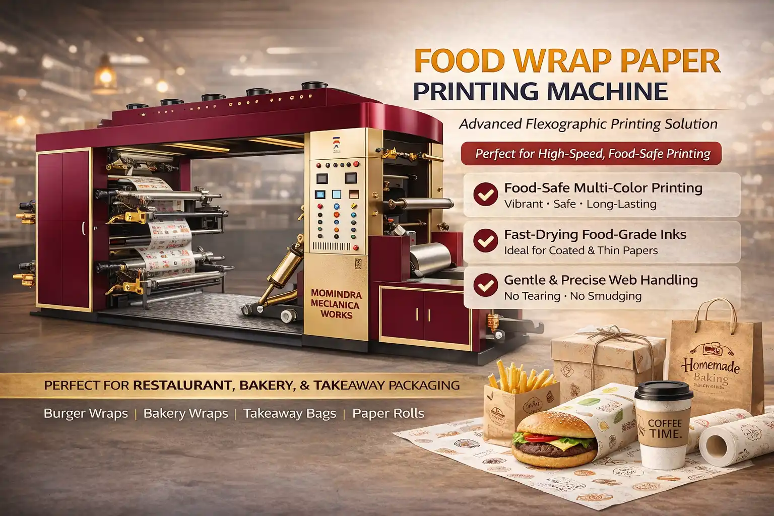 This machine is widely used for printing on food packaging papers used in restaurants, bakeries, and takeaway services.