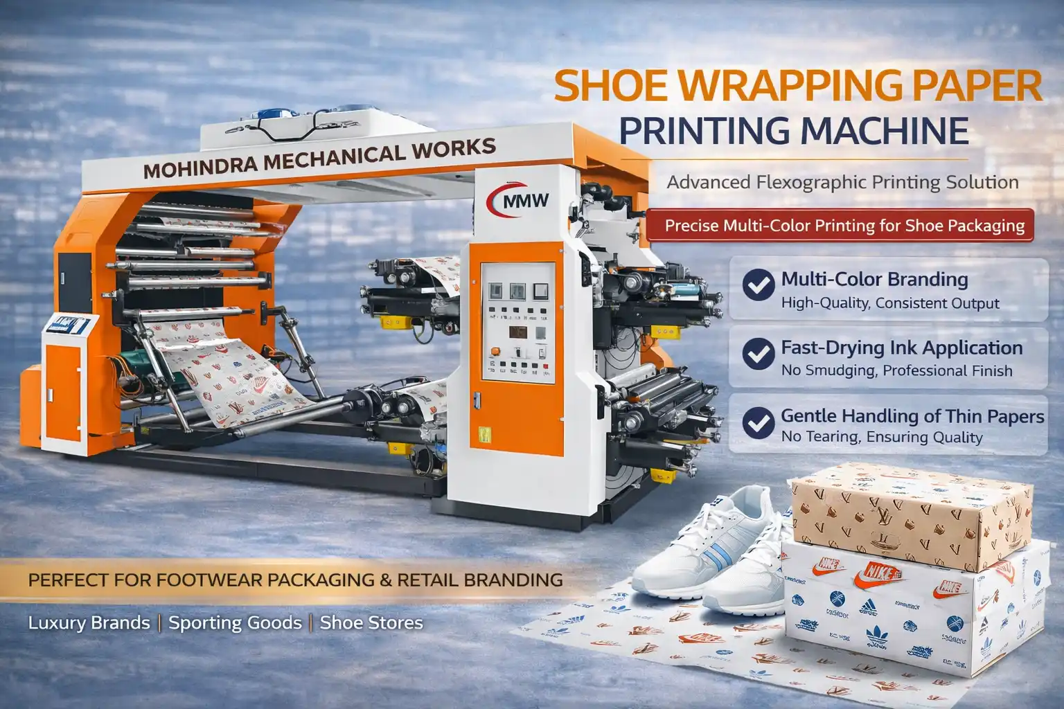 This machine is widely used for printing on shoe wrapping paper used in footwear packaging and retail branding.