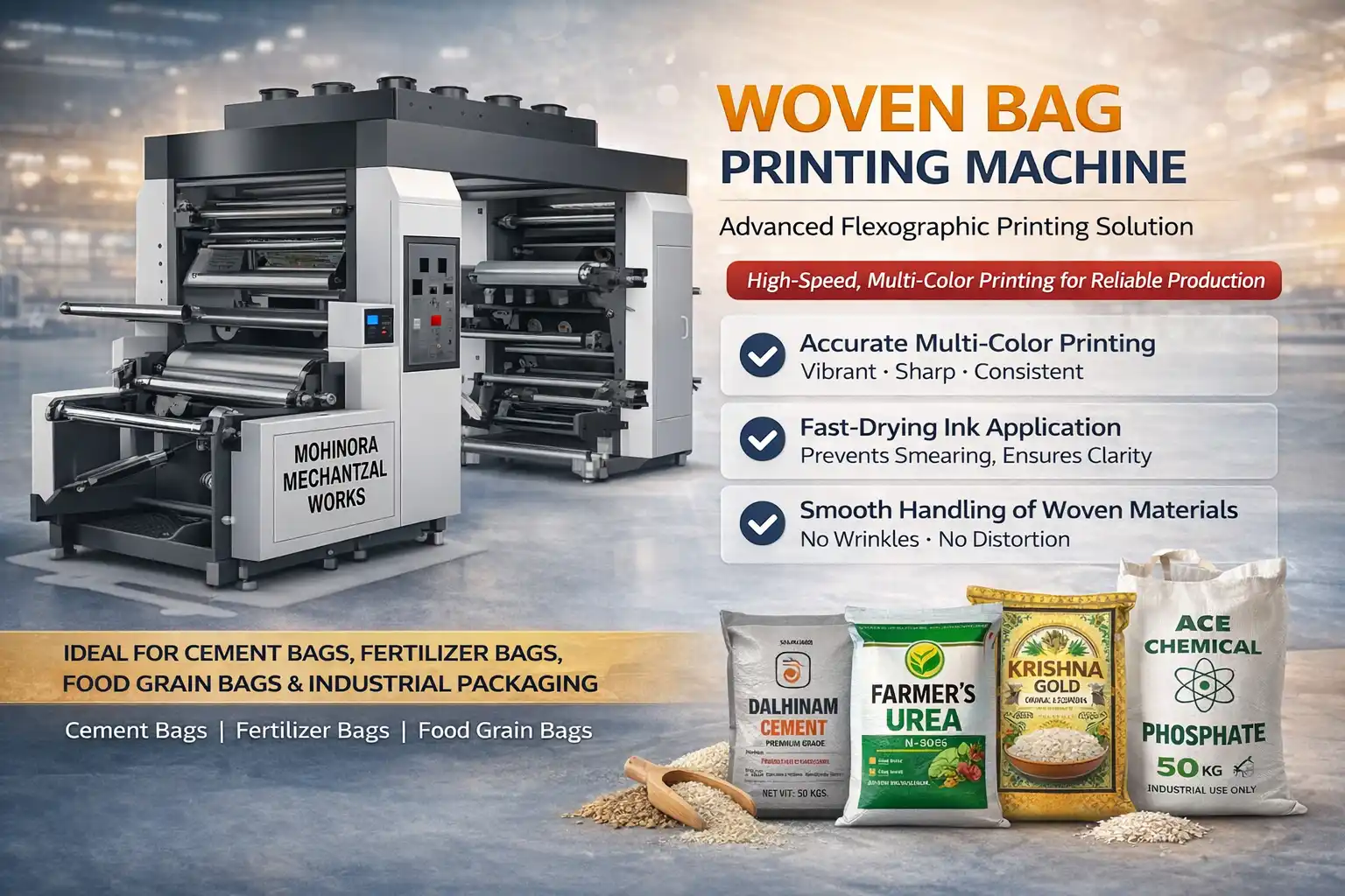 This machine is widely used for printing on cement bags, fertilizer bags, rice bags, flour bags, and industrial woven packaging materials.