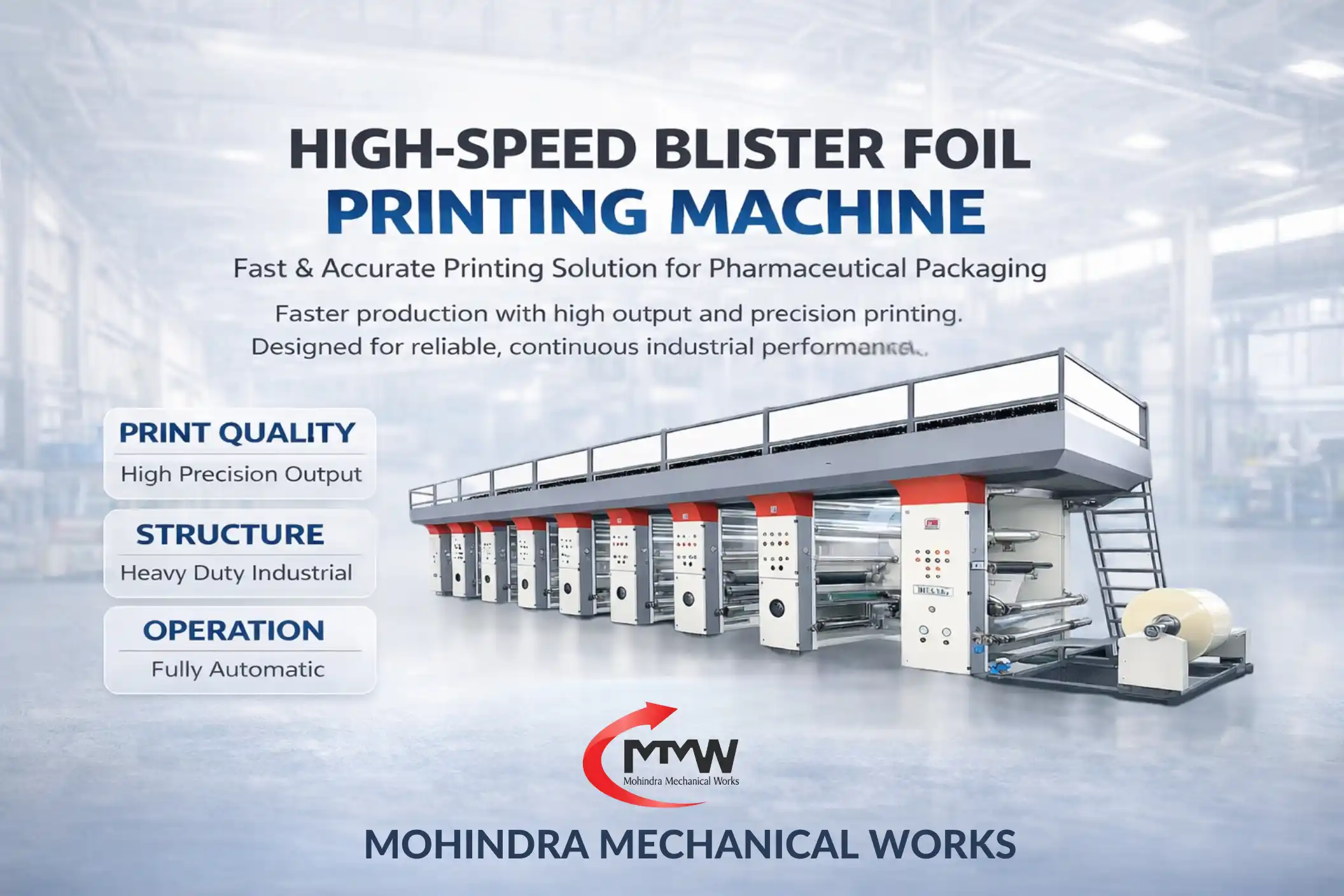 The High-Speed Blister Foil Printing Machine is engineered for rapid and precise printing on aluminum blister foils used in pharmaceutical packaging. It ensures sharp, clear, and consistent printing of essential details such as batch numbers, expiry dates, manufacturing information, and branding.